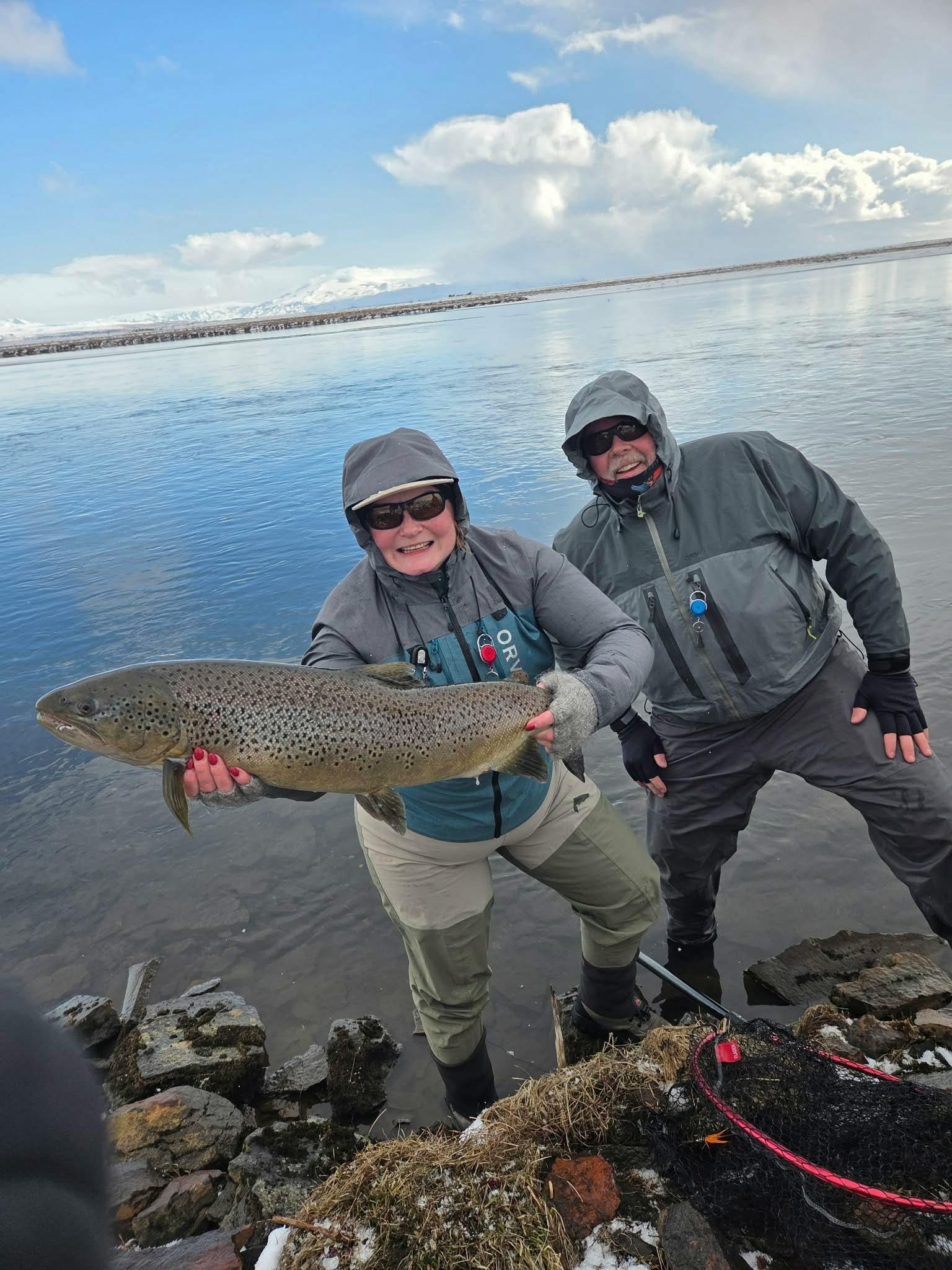 Auður Ösp Jónsdóttir fagnaði afmælinu sínu í veiði í Ytri-Rangá í dag og dagurinn var eftirminnilegur. Hún fékk þennan 80 cm afmælissjóbirting sem hún landaði eftir talsverða baráttu á Bökkum. Fiskurinn tók Snældu. Það komu alls 7 birtingar á land