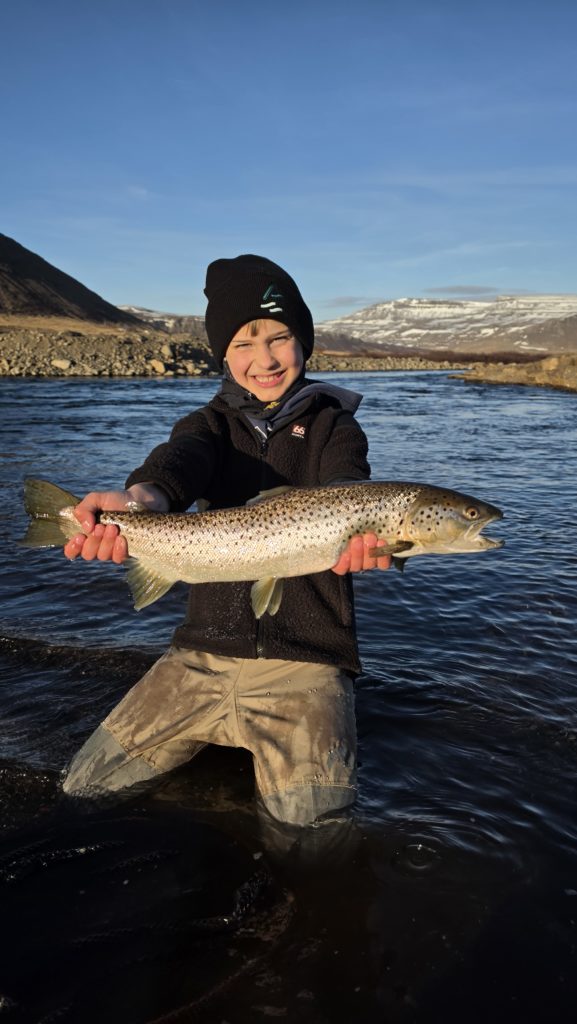 „Þessi ungi veiðimaður fékk fyrstu fiskana sína. Hrafnar Jón Gíslason 9 ára, tók 4 fiska um helgina. Frá 50 cm upp í 62 cm sjóbirtinga,“ sagði Gisli Kristinsson um veiðitúr helgarinnar og bættir við; „fiskarnir tóku Toby spún. Veður var alls konar. Vatnshiti árinnar var um 5 gráður.