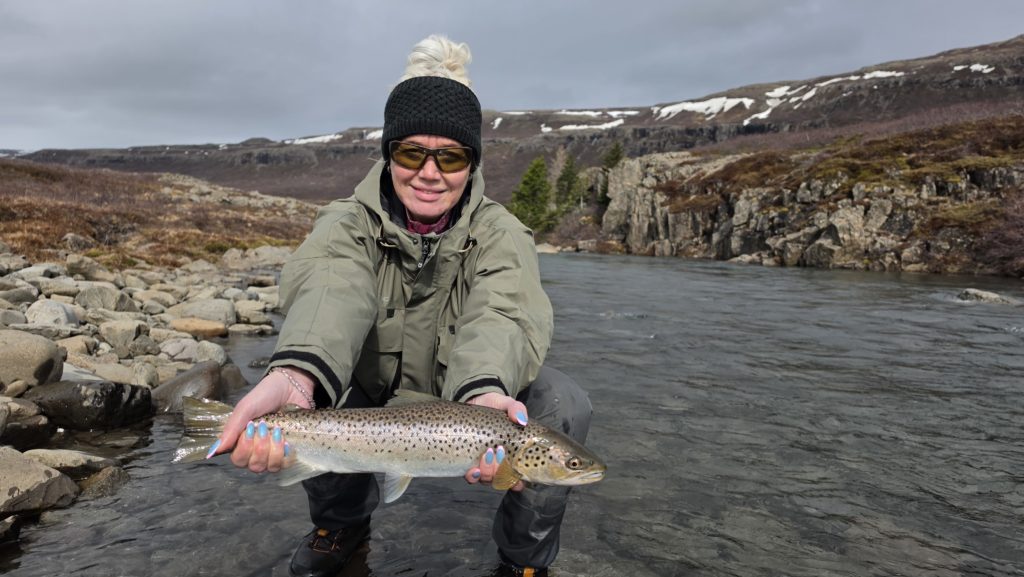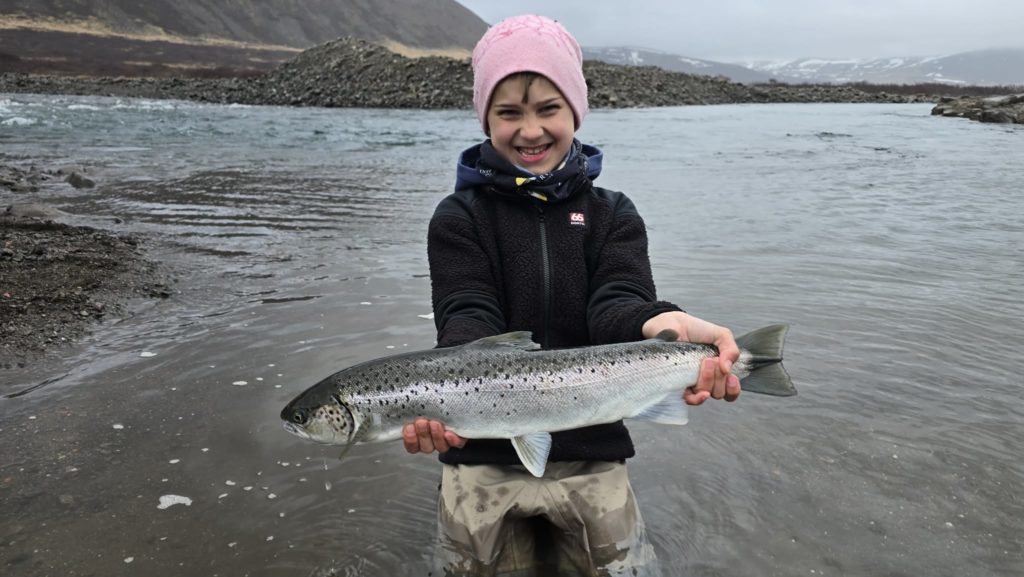 Hann var í skýjunum með fyrstu fiskana sína sem hann hefur veitt.  Hrafnar er upprennandi veiðimaður og lét kulda og leiðinlegt veður sko ekki stoppa sig. Svo í dag sunnudag fékk Rut Magnúsdóttir sinn fyrsta sjóbirting líka. Hann var örlitið minni eða ca 50 cm,“ sagði Gísli enn fremur.