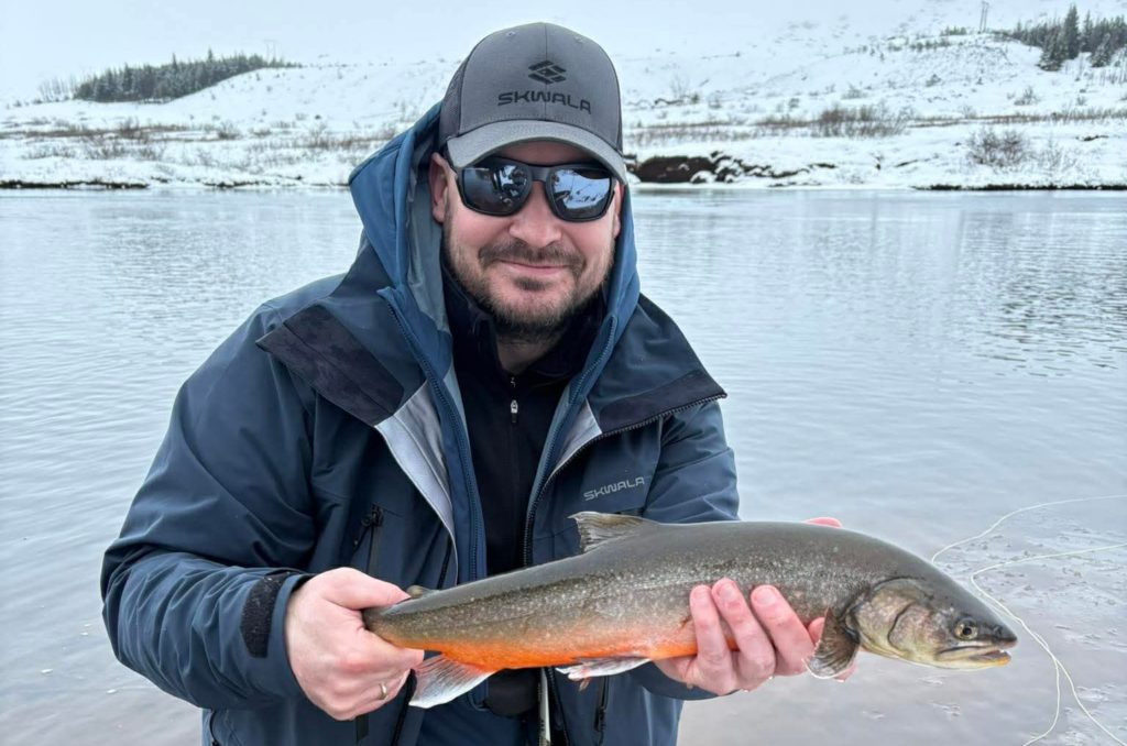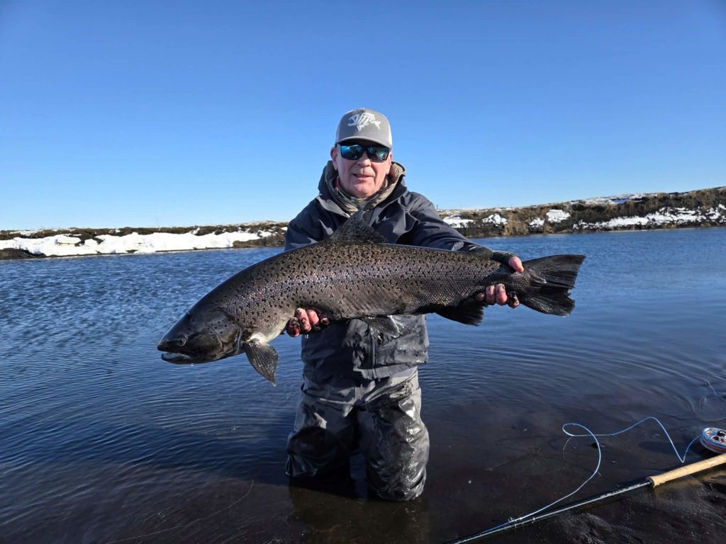 „Vorum nokkrir félagar að taka úr okkur hrollinn enda Þrastalundur fullkominn í það,“ sagði Magnús Stefánsson og bætti við; „milli snjóstorma gerði algjöra stillu og þá tók þessi fallega bleikja litla vínil púpu,“ sagði Magnús enn fremur.