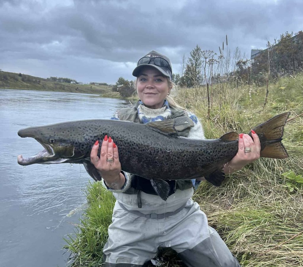 Rakel Ósk fékk þennan glæsilega 95 cm hæng í Ytri-Rangá síðasta þriðjudag og í