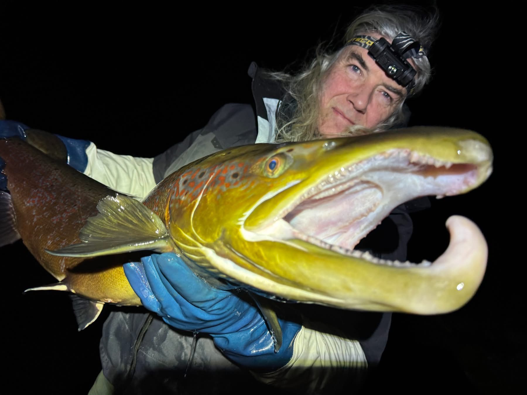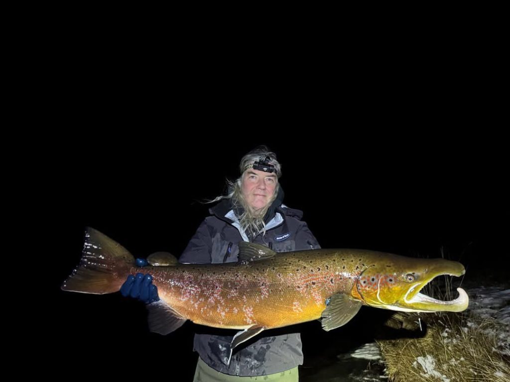 Þegar ég las hreistur laxins kom í ljós að hann var runninn frá hrygningunni haustið 2019. Sem hrogn dvaldi hann í malarbotni Haffjarðarár um veturinn þar til hann hængur vor klaktist úr hrogninu sumarið 2020. Þá upphófst býsna sögulegt líf þessa lífseiga upprennandi laxajötuns Haffjarðarár. Æskuár hængsins í heimaá hans, Haffjarðará, voru ekki mörg því hann var hraðvaxta; hann gekk til sjávar sem gönguseiði einungis 2 ára gamall (2+) – á þriðja sumri í lífi sínu, sumarið 2022. Á ætisslóðum sínum í hafi dvaldi Haffjarðarárjötuninn í 2 ár. Í kjölfar hafvistar sinnar gekk sá stóri til hrygningar í Haffjarðará í fyrsta sinn sumarið 2024 þá fjögurra ára gamall (4+). Vorið 2025 gekk jötun vor í sjó öðru sinni á ævinni til að sækja sér æti í úthafinu. Hann dvaldi í hafi fram eftir sumri þar til hann gekk til hrygningar öðru sinni í Haffjarðará – nú í sumar þá 6 ára gamall (6+). Þar tók Haffjarðarárjötuninn þátt í hrygningunni haustið 2025 og var enn við þá iðju nú í vetrarbyrjun er fundum okkar bar saman í ánni.