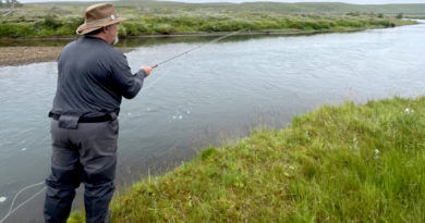„Það er mikið af fiski víða í ánni og alla vega þrír fiskar yfir 100 sentimetra og einn svoleiðis tók hjá mér. Laxinn var á í einar fimm mínútur en losaði sig af eftir mikið fjör og ég reyndi að háfa boltann en þá braut hann hálfinn. Þetta var bara veisla og fjör, fékk einn flottan lax skömmu áður,“ sagði Eiríkur eftir að sá stóri slapp af.