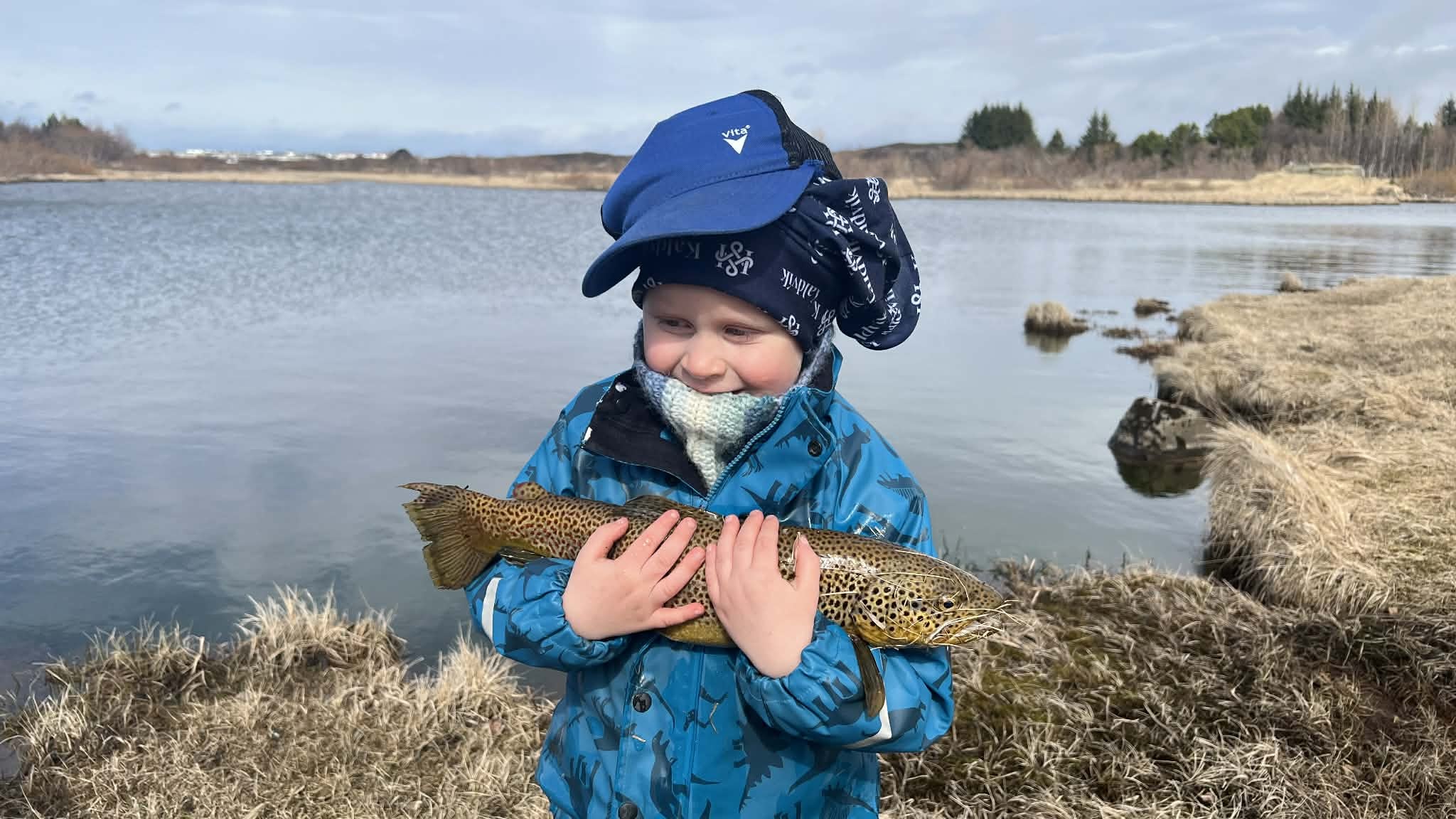 Gosmökkur lá yfir vatninu um helgina en þokan faldi það hálfpartinn . Fínt er að fara þarna til veiða með fjölskyldunni, allir geta veitt ódýrt en bara að vera með Veiðikortið, sem dugir við veiðiskap víðar um landið.