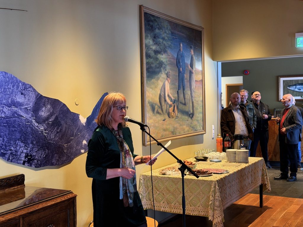 Guðrún Sigurjónsdóttir formaður Veiðifélag Norðurár flytur ræðu í afmælinu